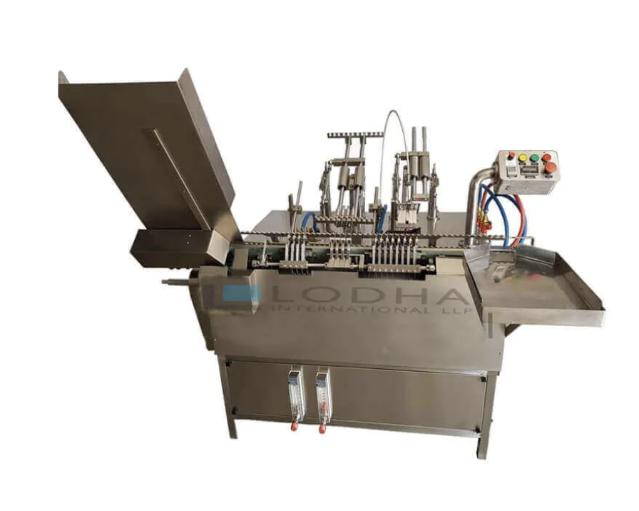 Machine built on principal of slant travel of ampoules while filling and sealing to take care wide variation of ampoule neck dimensions, thicknesses and ovality of available ampoules.